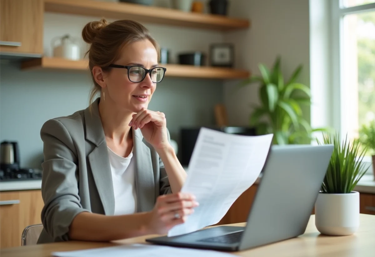 Femme d'âge moyen dans une cuisine lumineuse avec document et ordinateur